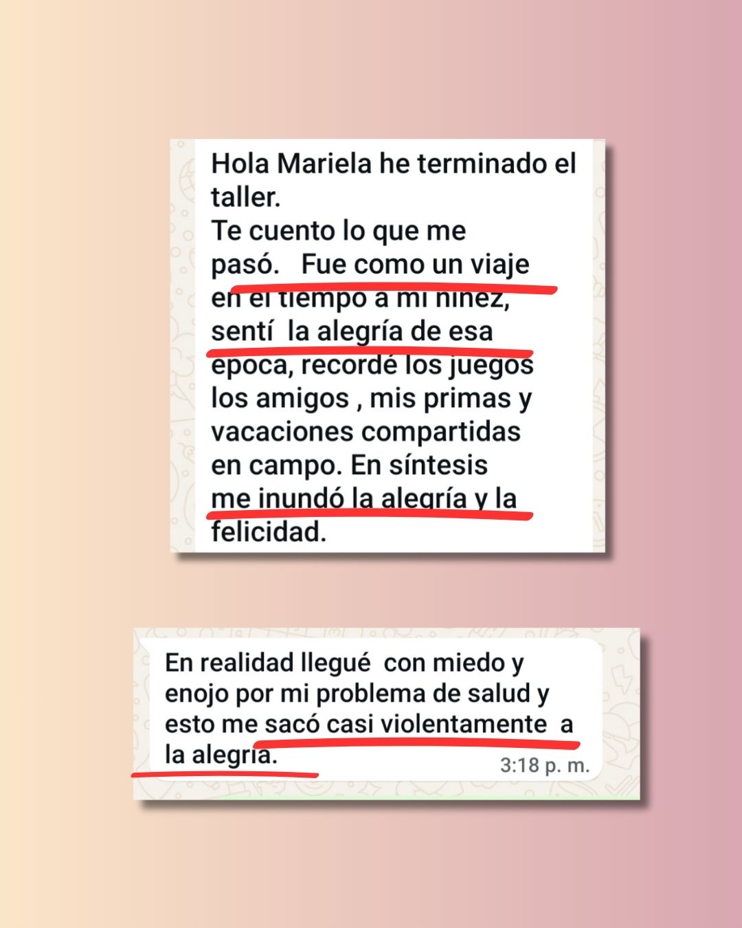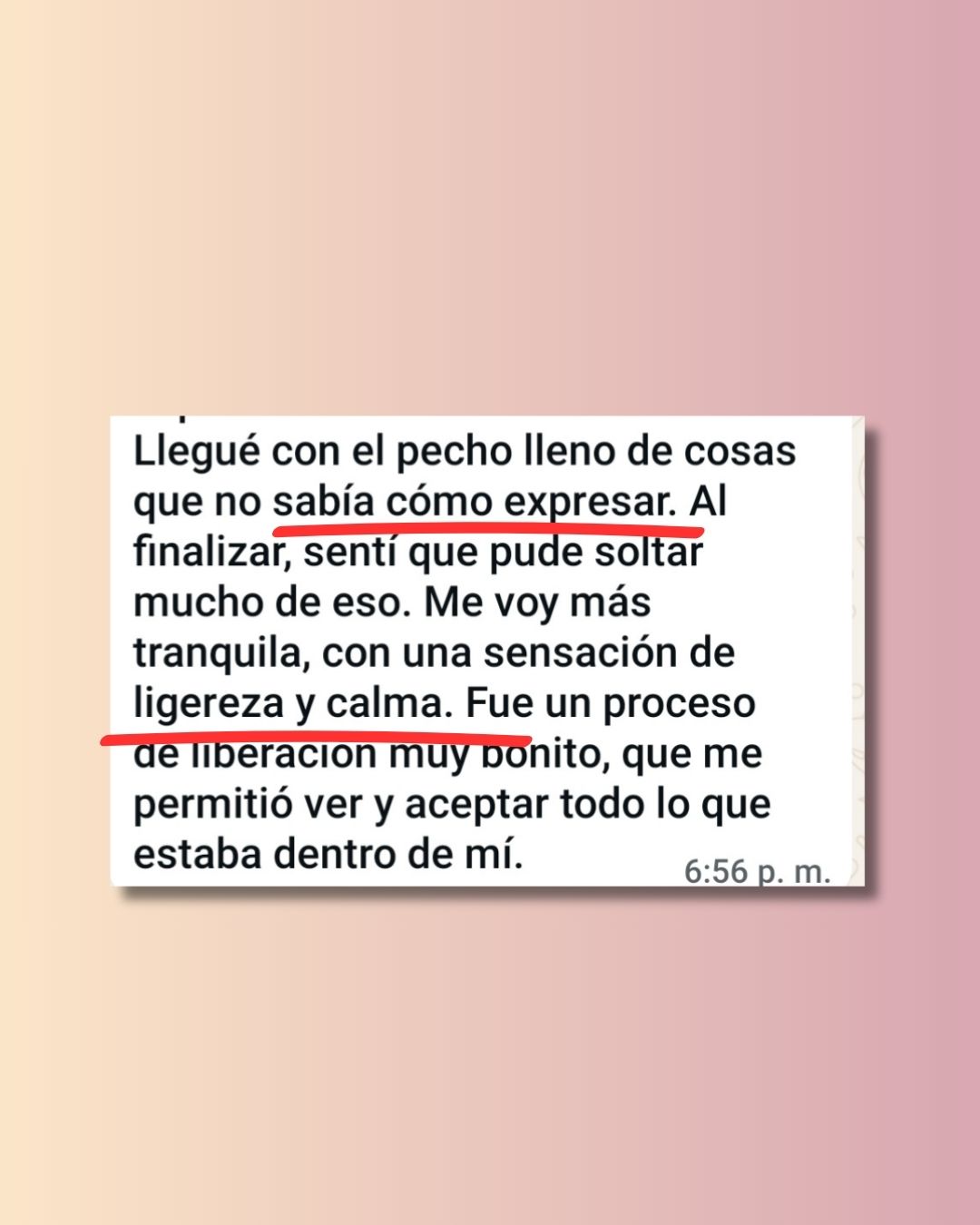 Es un taller que sigues a tu ritmo, con todos los recursos que tienes disponibles en la plataforma de cursos. Tendrás acceso a la información de por vida, porque cada vez que repitas el proceso, podrás encontrar experiencias y revelaciones diferentes.