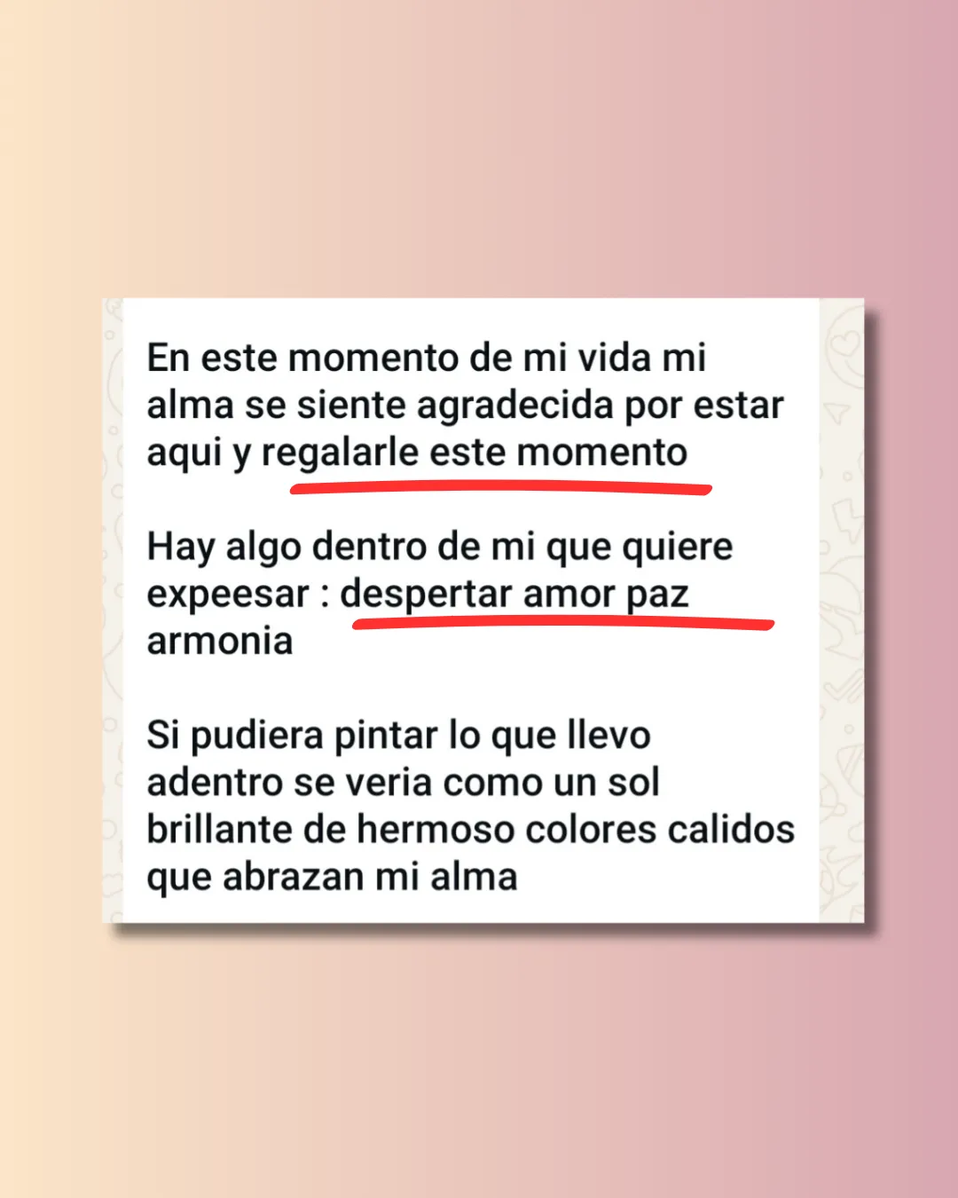 UN TRAZO PARA TU ALMA no es un taller donde el enfoque está en la técnica para pintar o en el resultado perfecto. Es una experiencia para sacar lo que está dentro, desbloquear tu creatividad y salir de aquí con la ligereza de haber soltado lo que pesa, o de haber visto lo que necesita sanar, lo hacemos a través de la meditación, la intención, la escritura y la pintura. Este taller es una experiencia expansiva para que puedas expresarte con libertad, sin miedo a hacerlo "bien o mal" sólo siguiendo tu intuición y confiando más que nunca en tu propio proceso y guía Divina.